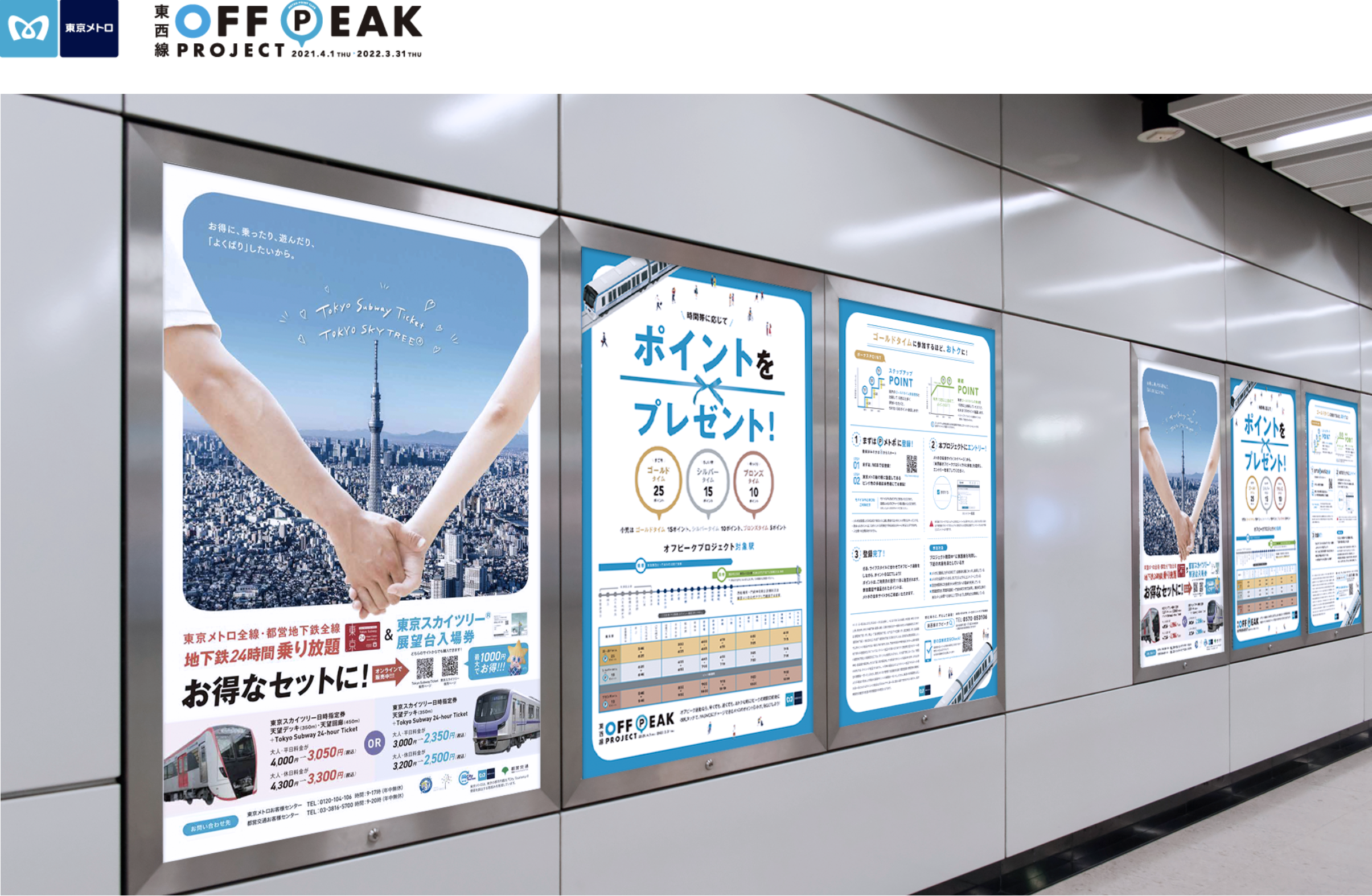 東京メトロ「OFF PEAK PROJECT」の交通広告制作を担当。複数のビジュアル方向性(約5〜10案)を検討し、コンセプト・トーン・レイアウトの違いを比較しながら最適なアウトプットを導出しました。新年に合わせた明るくポップな世界観をベースに、親しみやすさと信頼感のバランスを意識しています。